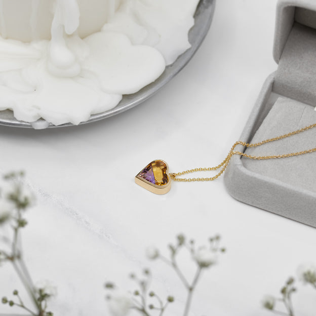This necklace features a gorgeous Ametrine heart. Ametrine is a gemstone that is partially Citrine and partially Amethyst. This combination of elements allows it to show a vibrant orange and a deep purple color at the same time. This purple and orange necklace is a perfect gift for a loved one due to the lovely heart design.