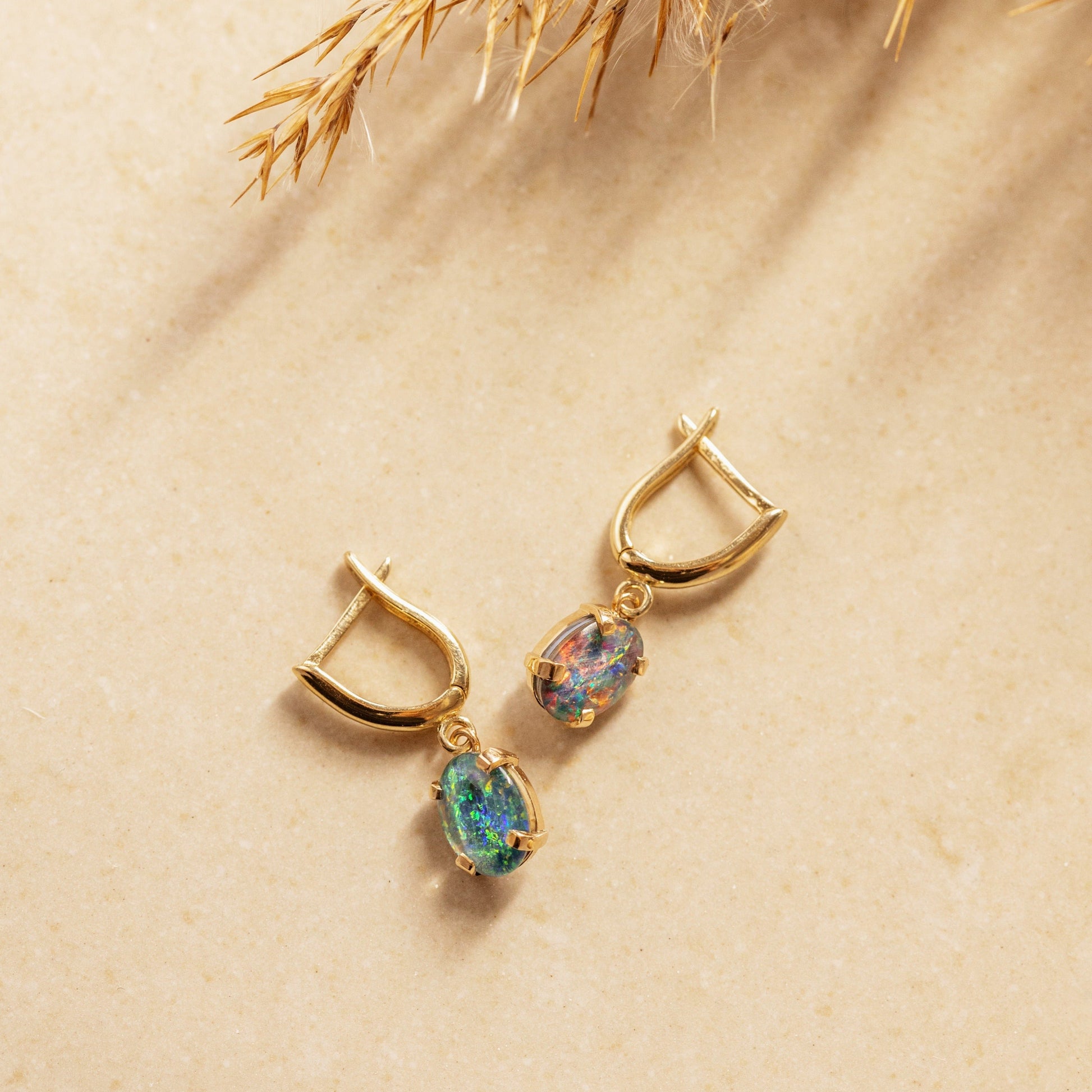 Custom Triplet Australian Opal earrings, featuring a stunning combination of Clear Quartz, Opal, and Onyx. Clear quartz shines on top, while the mesmerizing Opal takes center stage. Underneath, the grounding presence of Onyx enhances both beauty and strength.