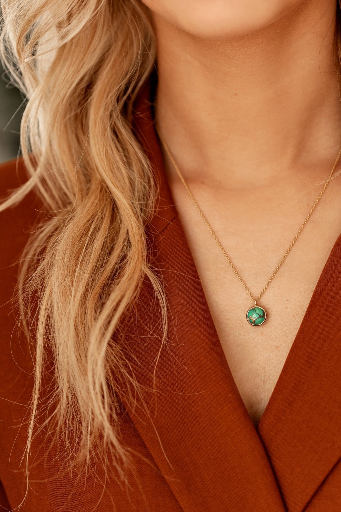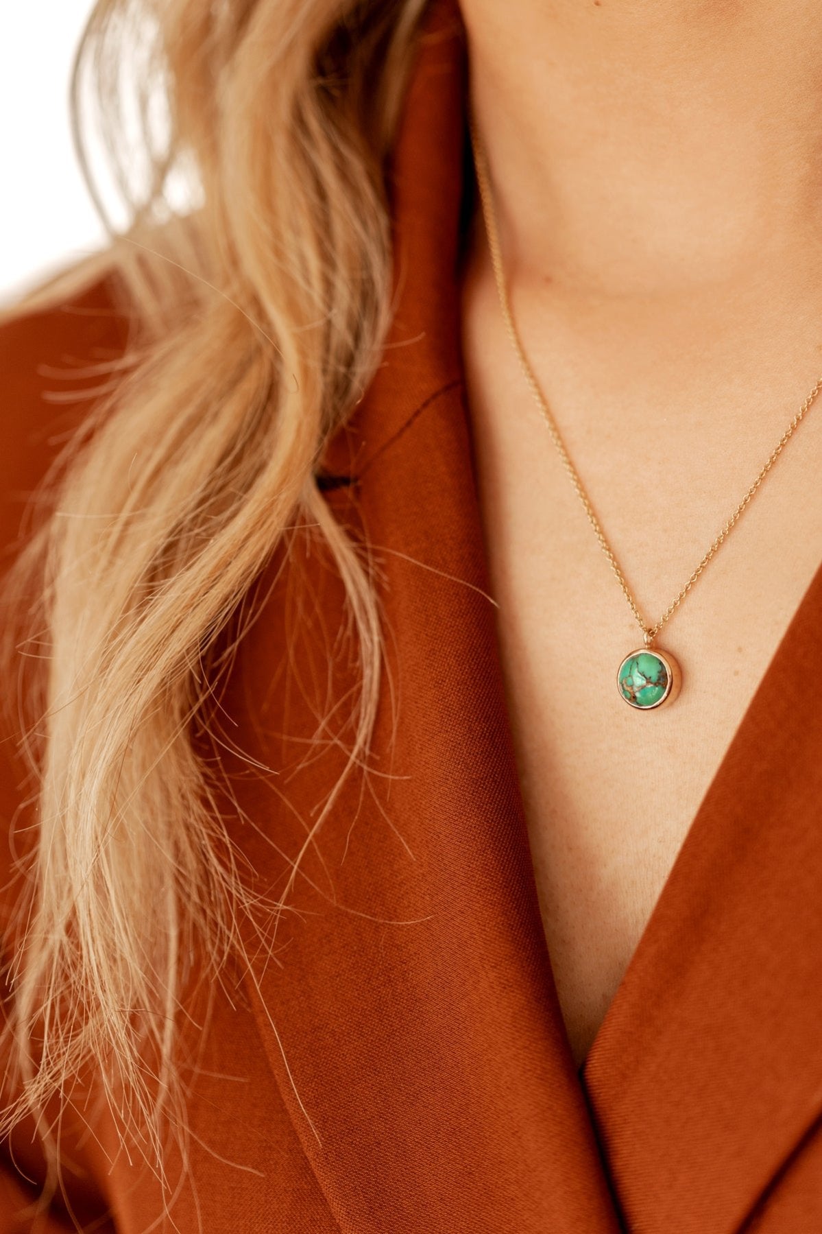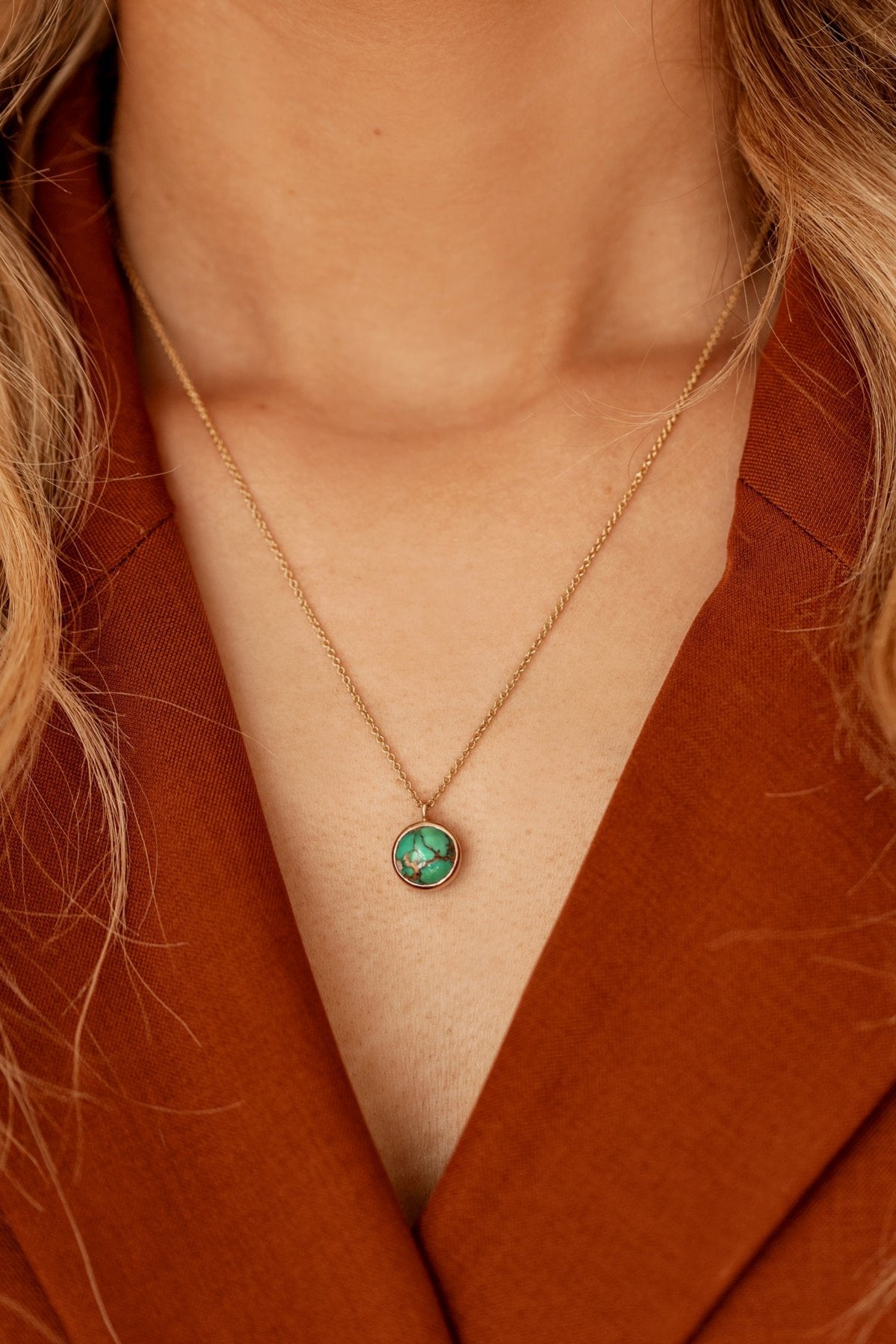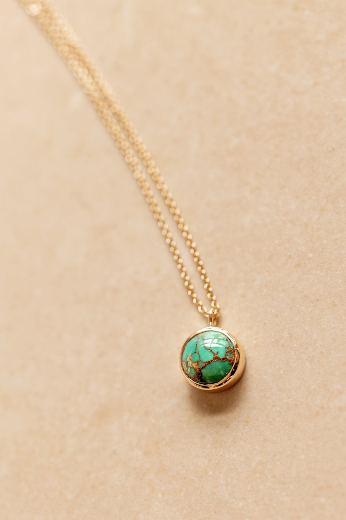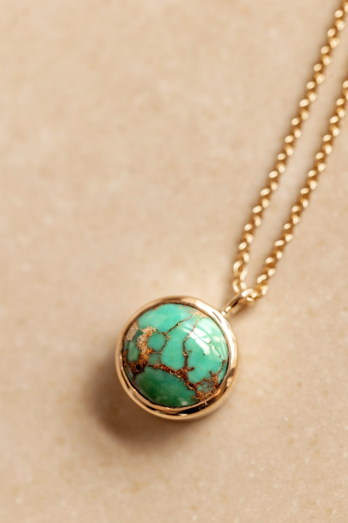 Discover the essence of elegance with this one-of-a-kind necklace featuring a stunning round Persian turquoise gemstone. Encased in a unique 14k gold bezel setting, the vibrant blue of the turquoise is beautifully complemented by intricate detailing that adds a touch of sophistication.