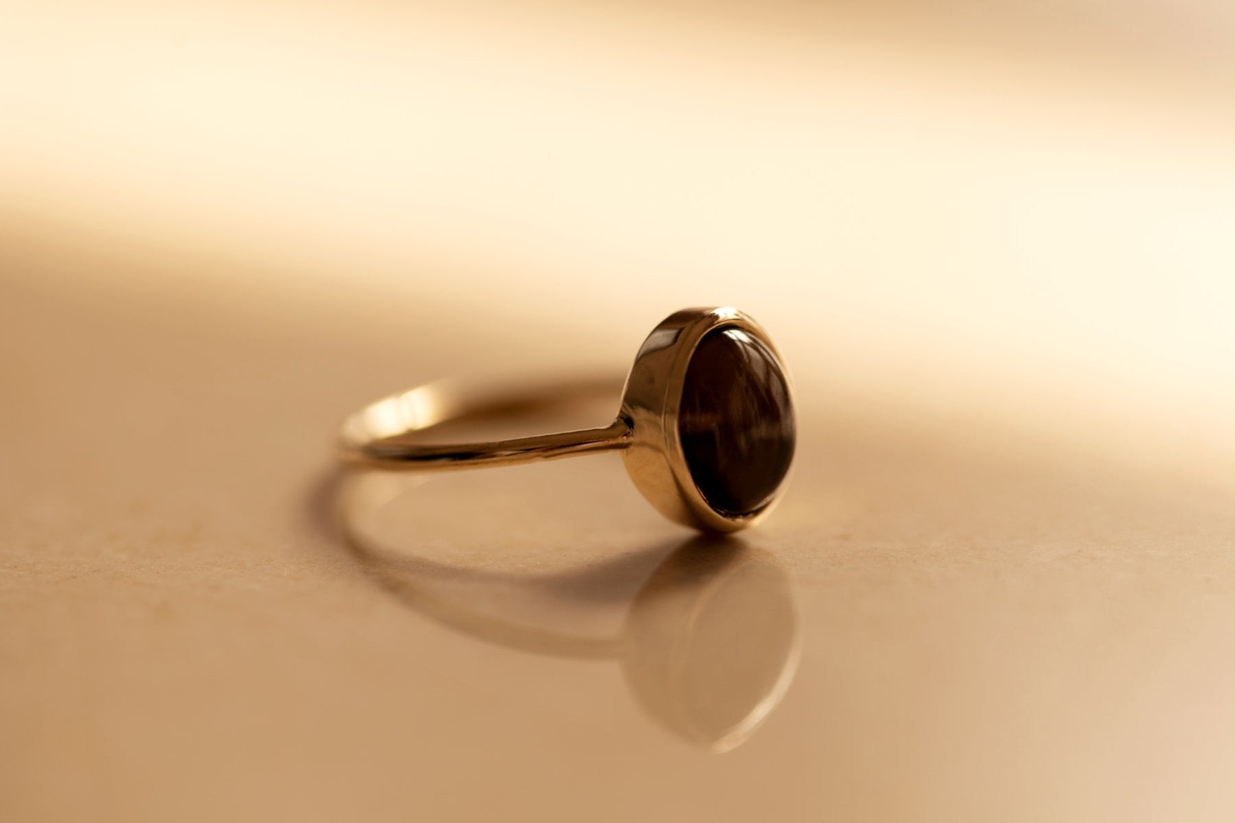 Discover the captivating allure of our exquisite oval black star sapphire ring, elegantly bezel set in lustrous 10K yellow gold. This stunning piece showcases a striking black star sapphire, renowned for its unique asterism—a phenomenon that creates a mesmerizing star-like pattern across the surface of the stone, captivating the light with every movement.