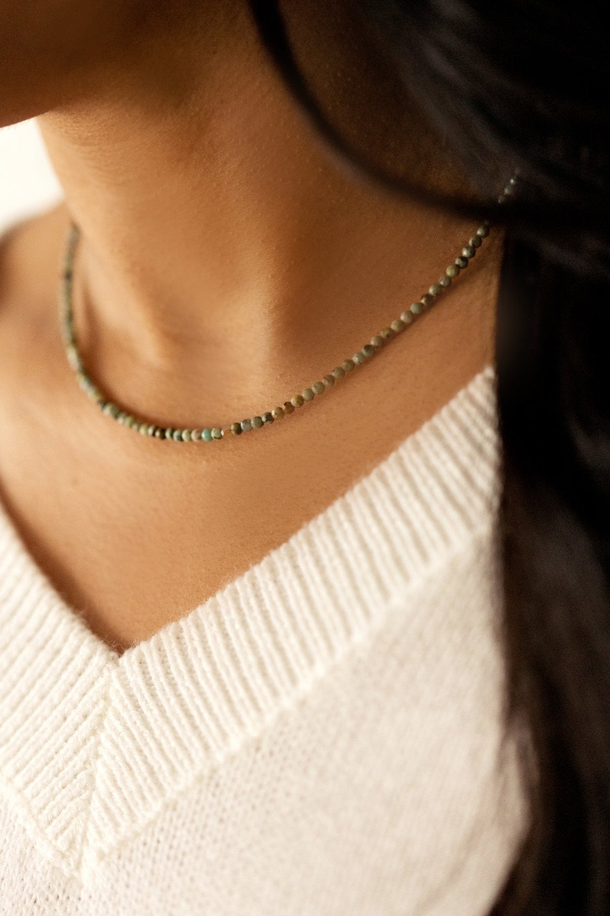Stunning 16-inch choker necklace, beautifully crafted with 2.5mm African turquoise beads. Each bead showcases the striking blend of deep greens and intricate veining that African turquoise is known for, making every piece unique and full of character.