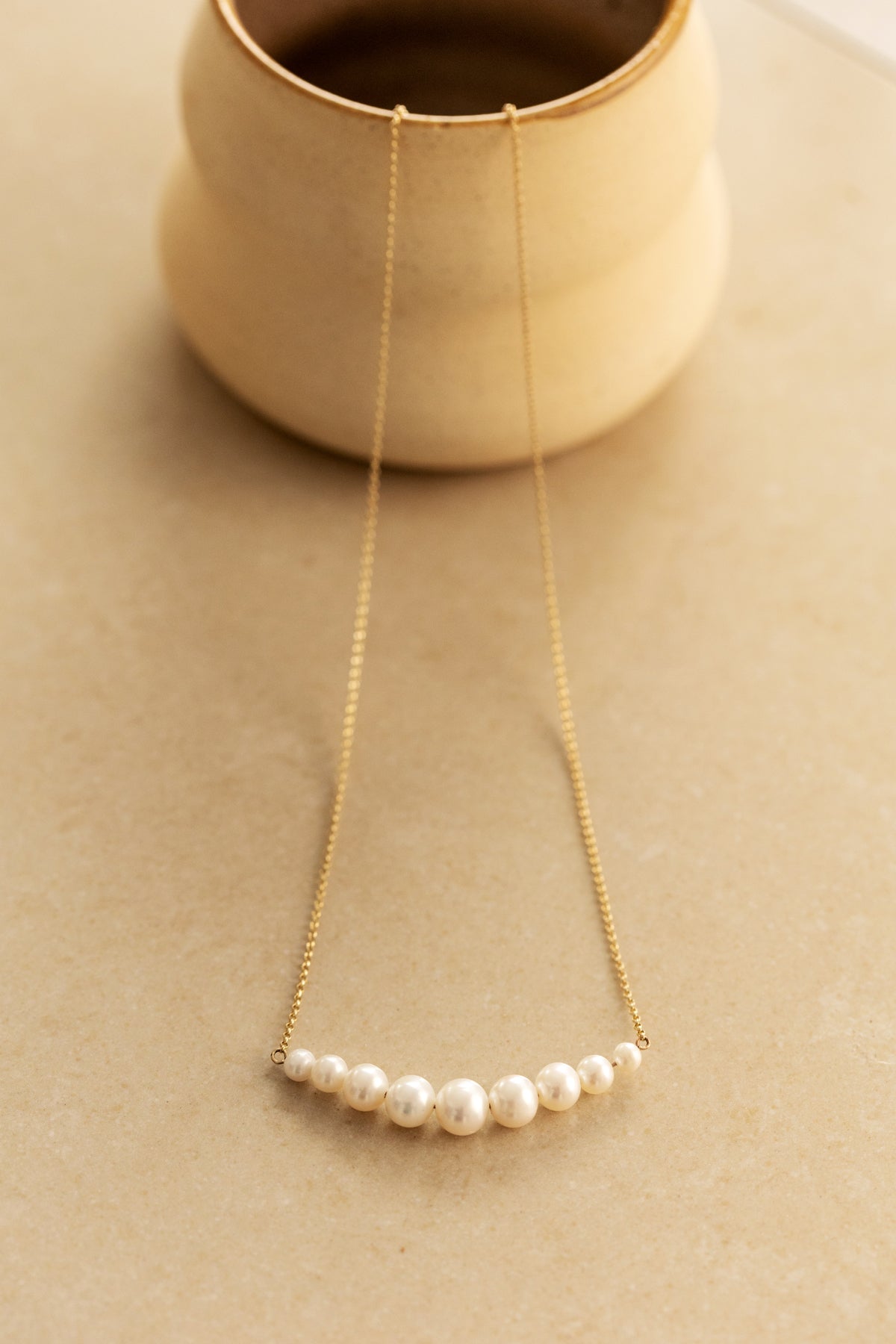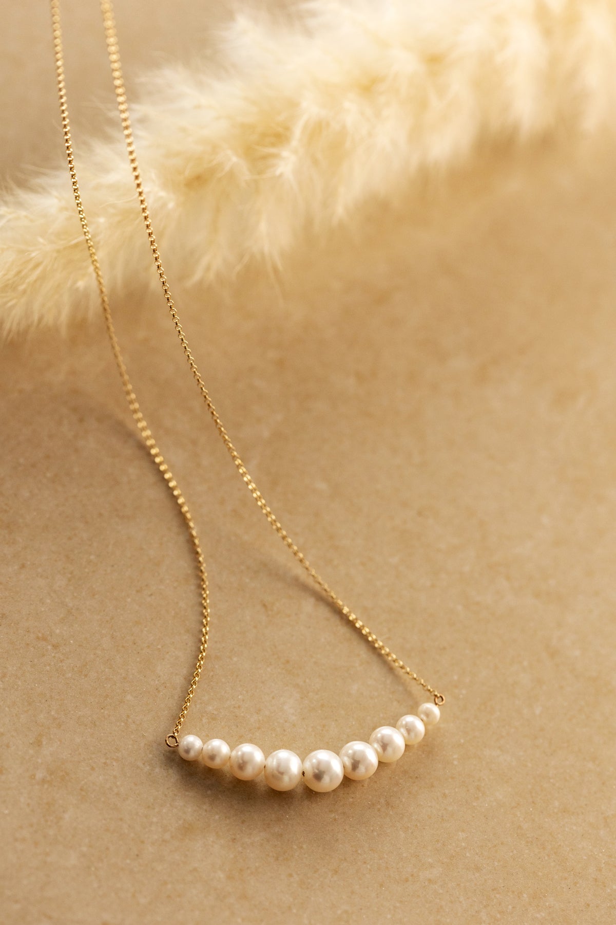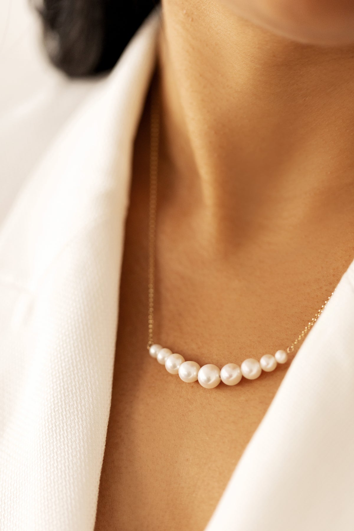 Available in your choice of 10k or 14k yellow gold, as well as 14k rose gold, this necklace offers versatility to suit any style or occasion. The warm tones of the gold enhance the iridescent quality of the pearls, ensuring that each piece radiates sophistication and charm.