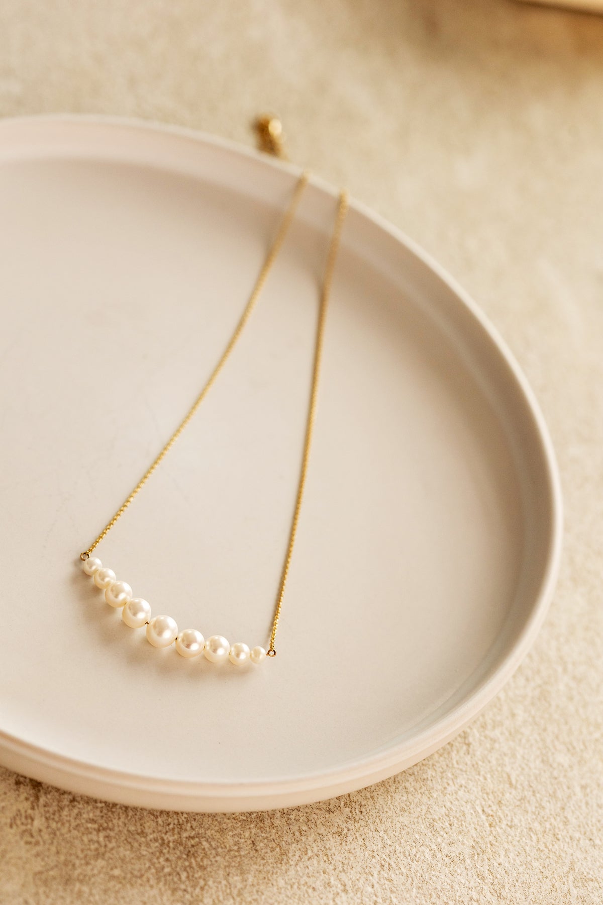 Indulge in the timeless elegance of this exquisite gradual pearl necklace, featuring a stunning arrangement of nine natural freshwater pearls. The design begins with petite 4mm pearls, gradually increasing in size to a magnificent 7mm at the center, before tapering back down to 4mm, creating a harmonious flow that beautifully frames the neckline.