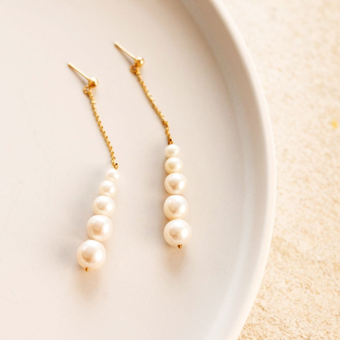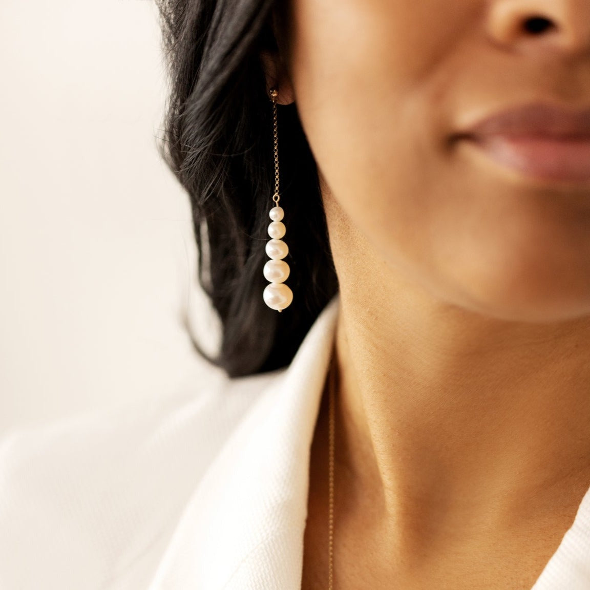 Elevate your style with these enchanting earrings featuring five exquisite freshwater pearls gracefully suspended from a delicate 14k yellow gold chain.