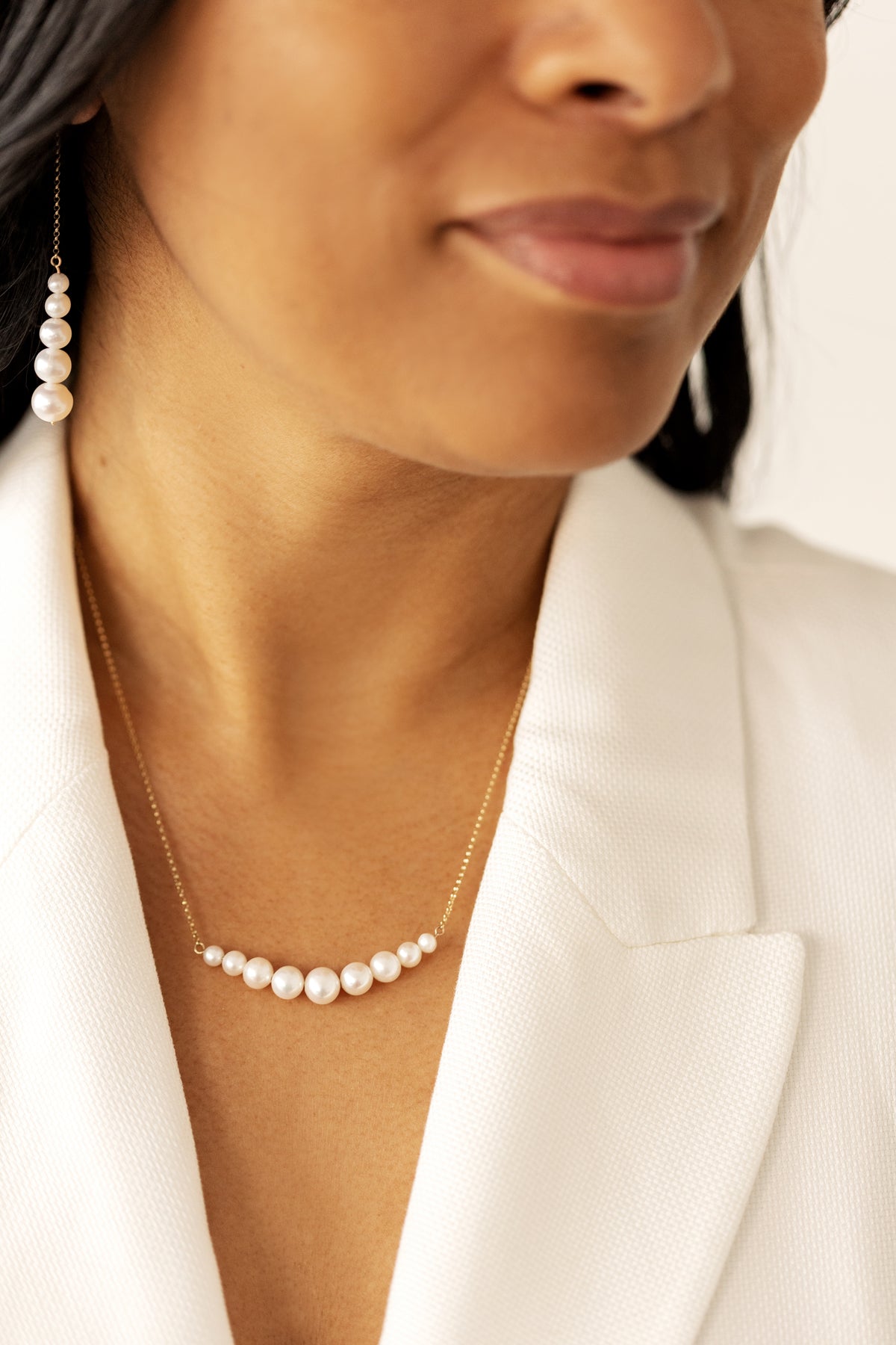 Ranging from 4mm to 7mm in size, the pearls are arranged in a stunning graduated design that adds depth and movement to the piece. Each pearl radiates a soft, lustrous sheen, catching the light beautifully as you wear them.
