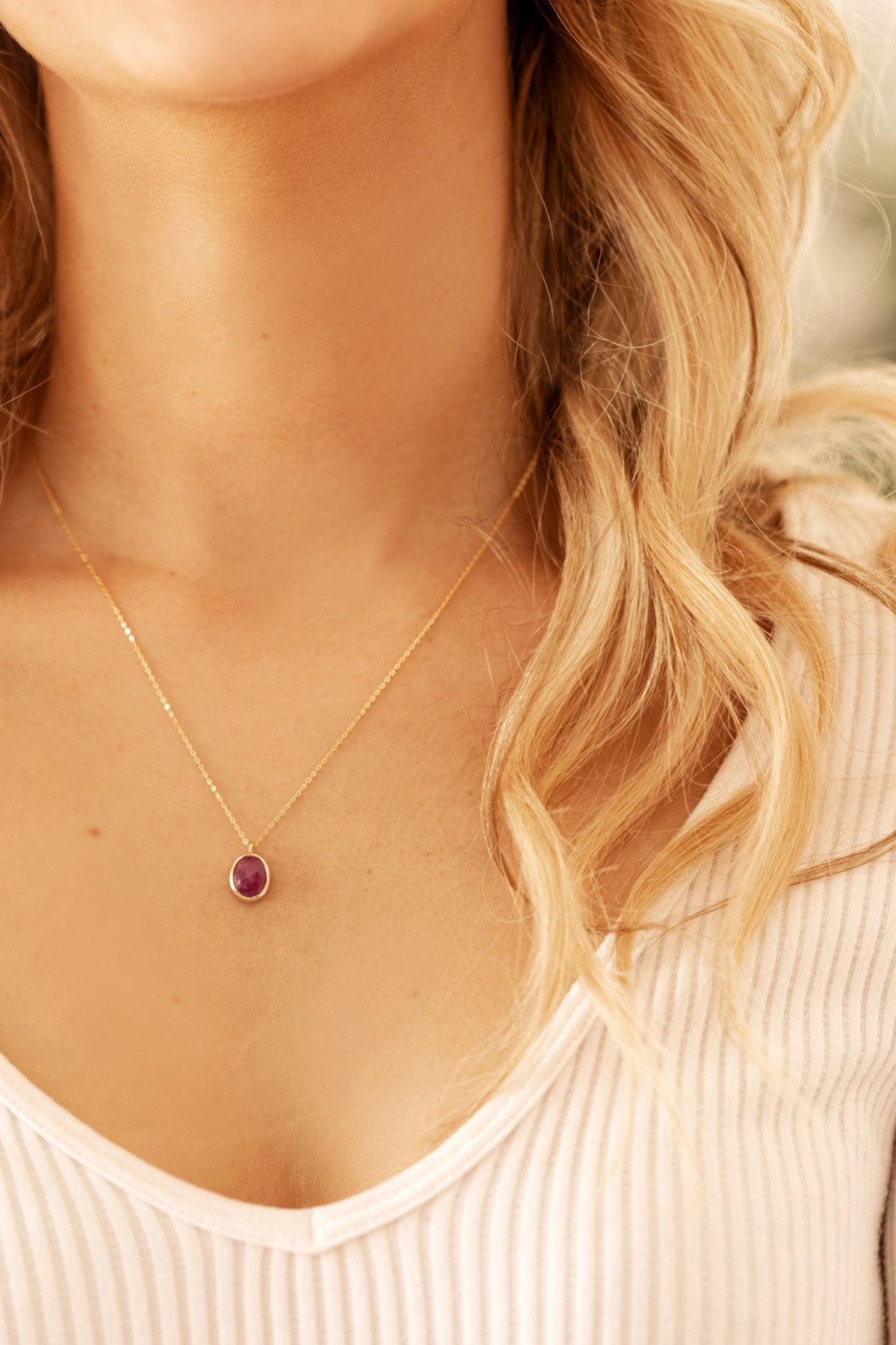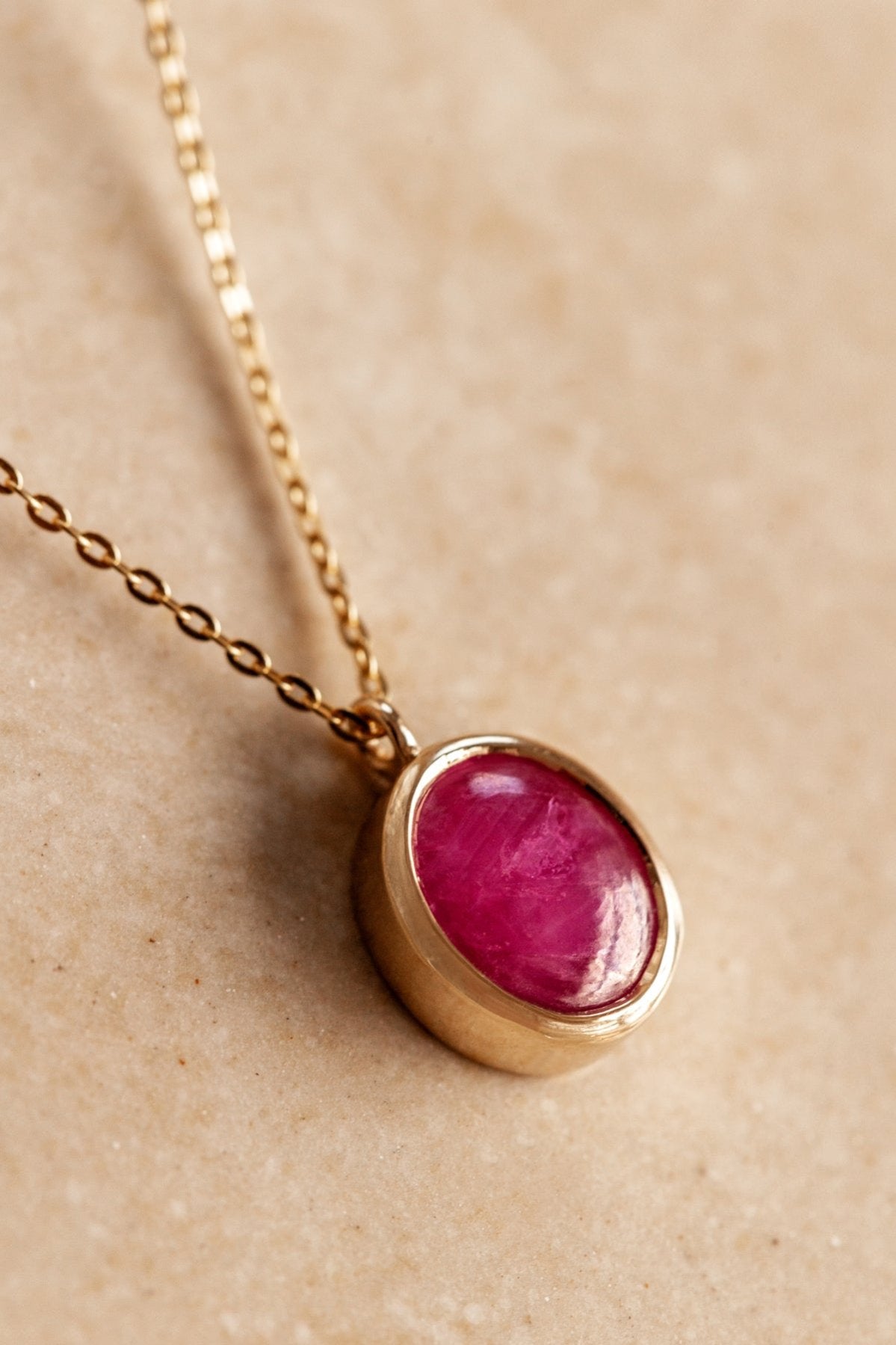 This alluring pendant showcases an oval cabochon natural ruby, treasured for its captivating crimson hue and brilliant sparkle. The ruby is meticulously bezel set in a radiant 10k yellow gold frame, amplifying its fiery colour and providing a touch of classic elegance. Suspended from a delicate 16-inch 10k gold fine cable chain, this pendant embodies passion and sophistication. The exquisite fusion of the ruby's intense red and the warm glow of the gold creates a timeless piece, ideal for both igniting everyday looks and adding a statement to special occasions. This pendant is a breathtaking testament to fine craftsmanship and the allure of natural beauty, making it a cherished addition to any jewellery collection.