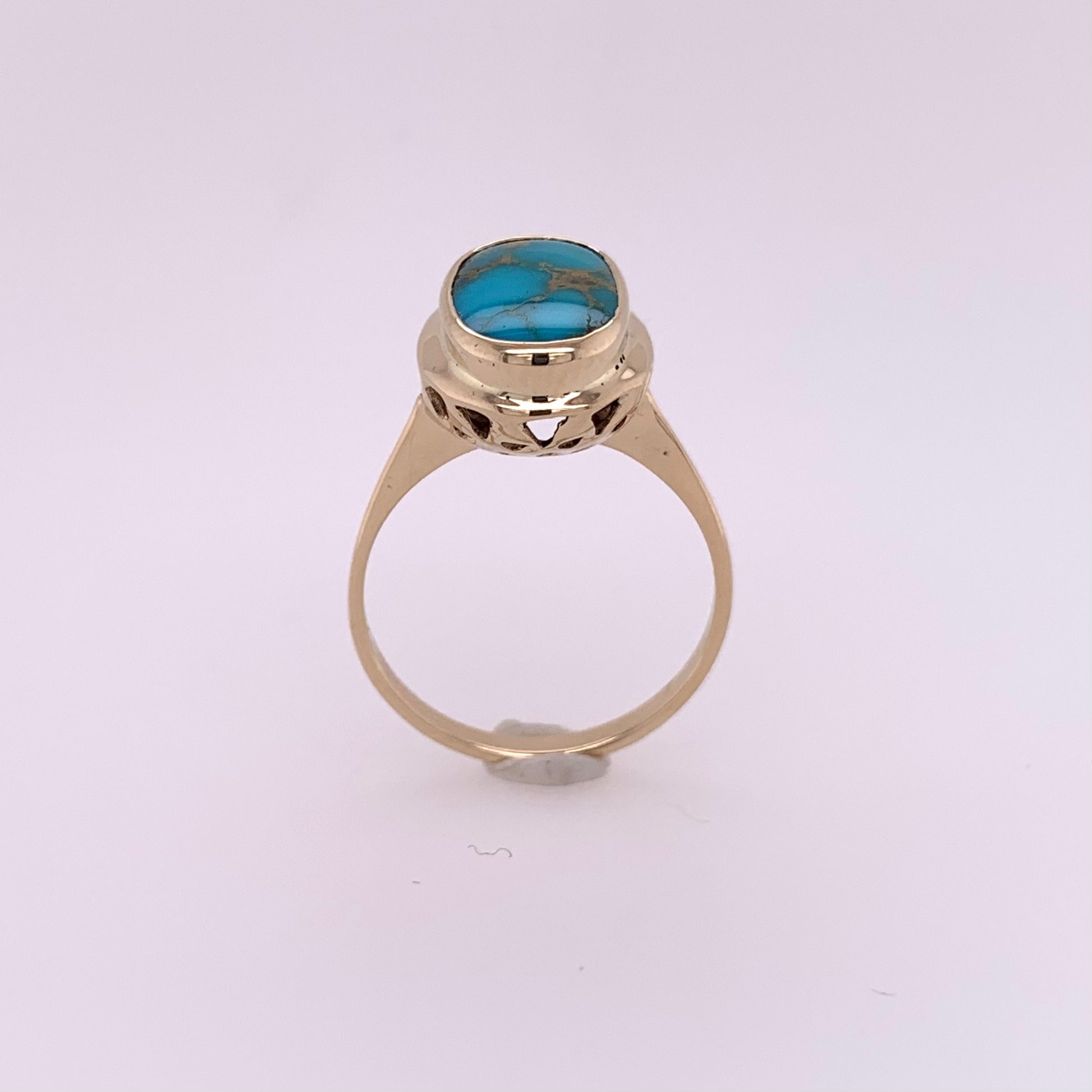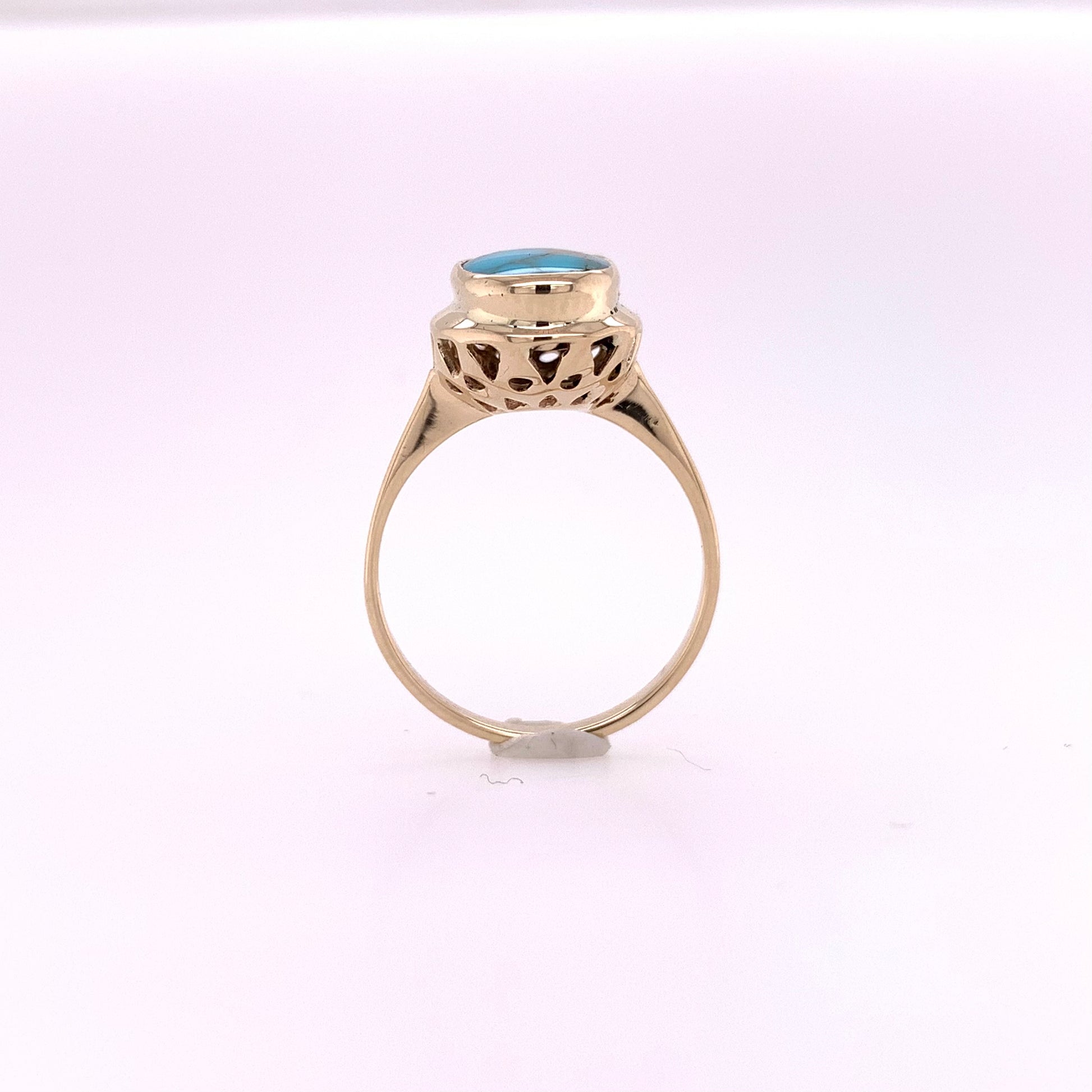 This exquisite cocktail ring features a high-quality, natural, untreated Persian turquoise in a unique oval cut, showcasing its vibrant color and natural beauty. The gemstone is securely set in a meticulously crafted, one-of-a-kind solid 14k yellow gold band, designed to highlight the stone’s elegance and timeless charm. Perfect as a bold statement piece, this ring combines sophistication with the allure of natural craftsmanship, making it a truly exceptional addition to any jewelry collection.